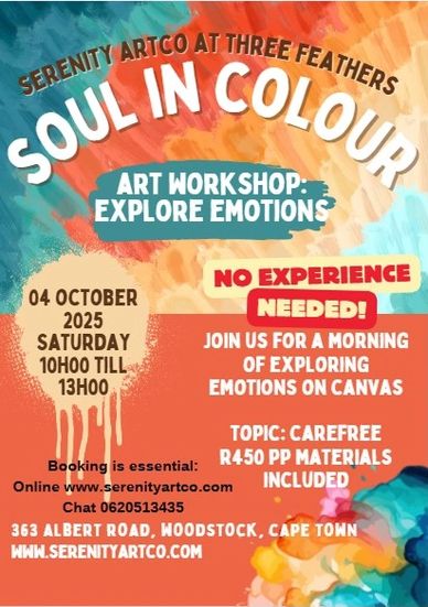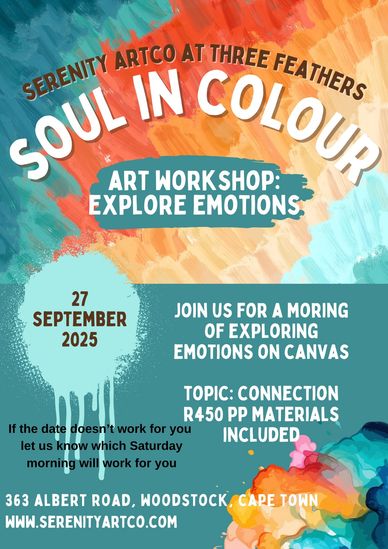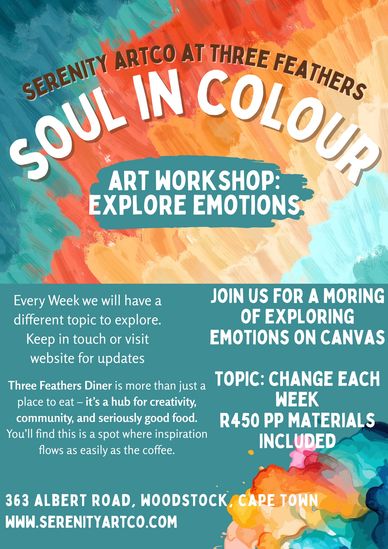Current event at Three Feathers Diner Woodstock Cape Town. Join us in expressing emotions with acrylic on canvas in a space that dares you to explore and express
